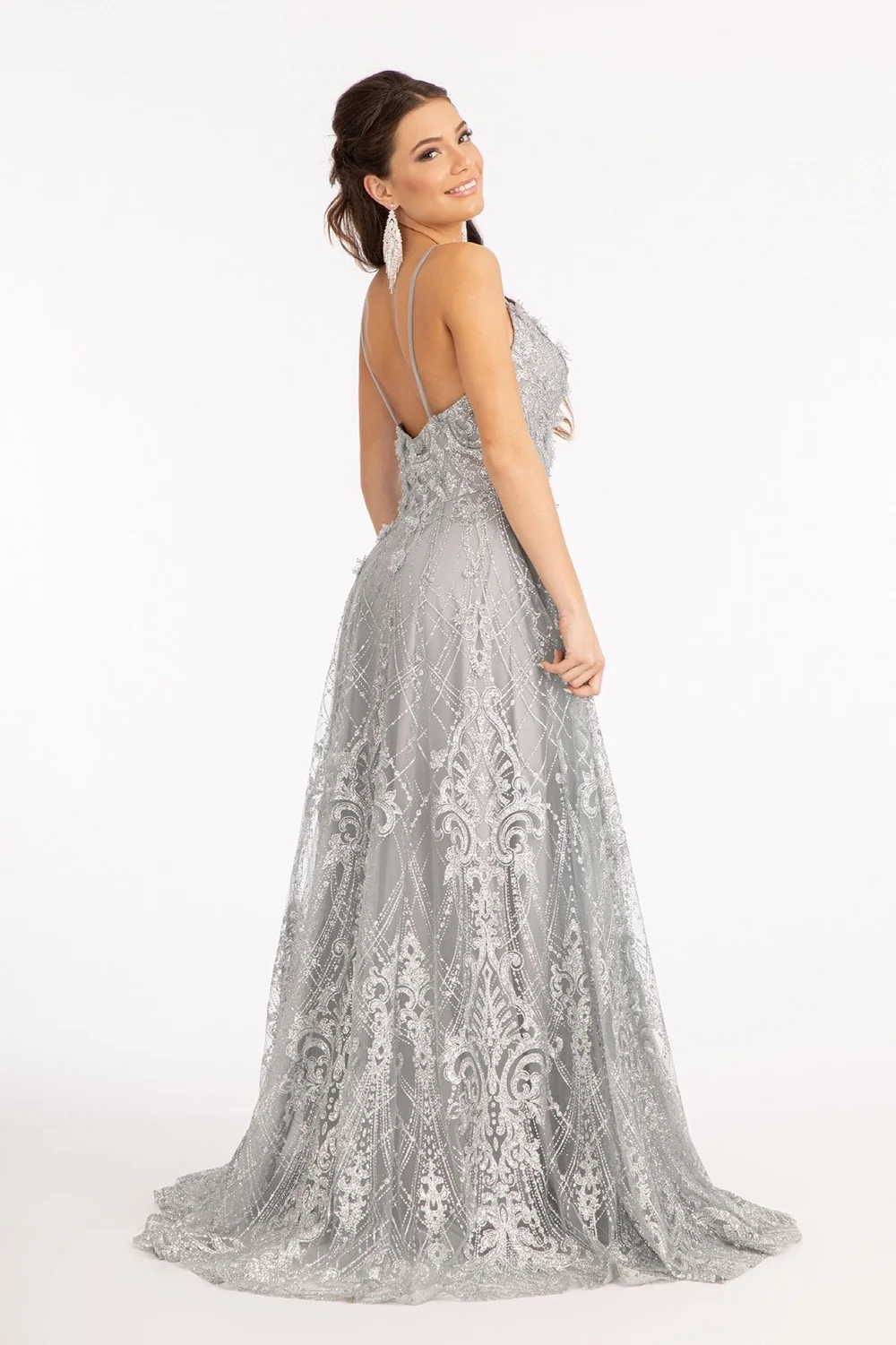 Gl3031 Gls By Gloria 3 D Flower Applique Mesh A Line Dress W Glitter Embellished And Side Slit Dress Haute